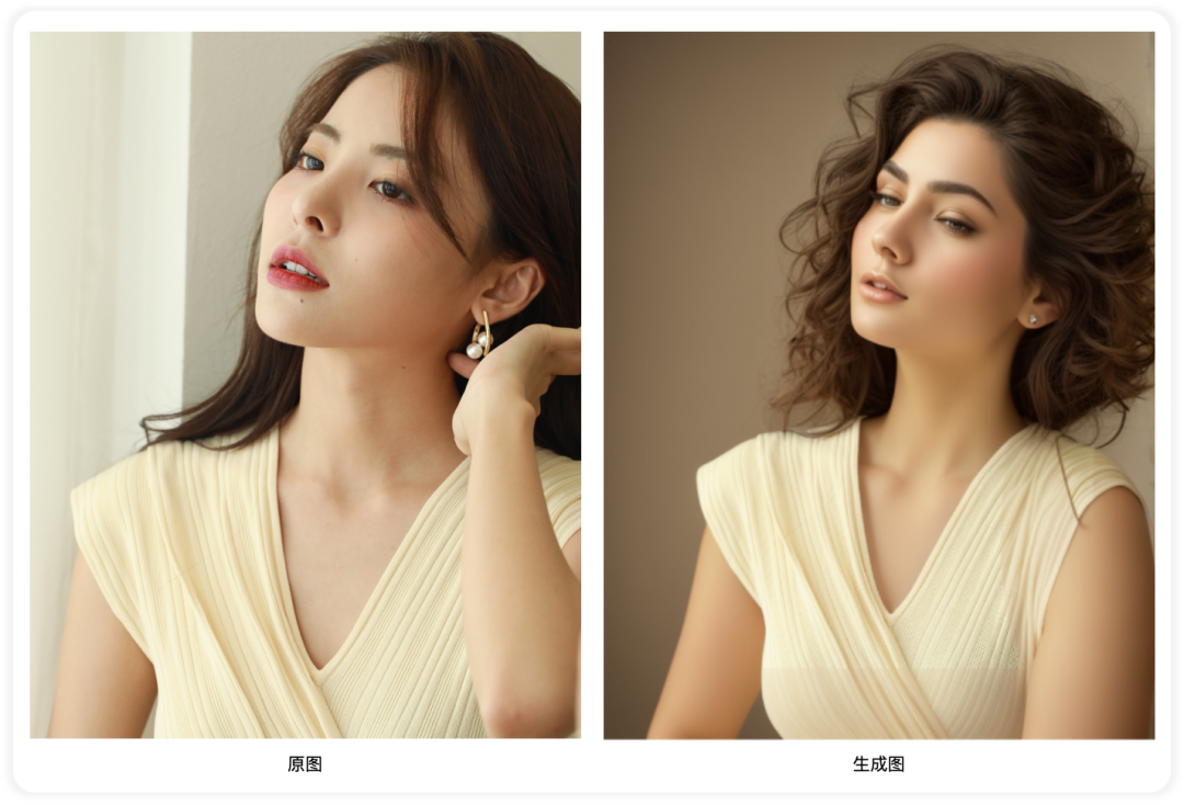 比如上傳(chuán)你想要參(cān)考的服裝圖,可以是真人模特或者人台,然後選擇需要的模特膚色、族裔,輸入風格關鍵詞,如「歐洲女模特」「時尚」「大氣」;點擊生成即可得到所需的新模特圖,生成效果逼真,無縫銜接替換。