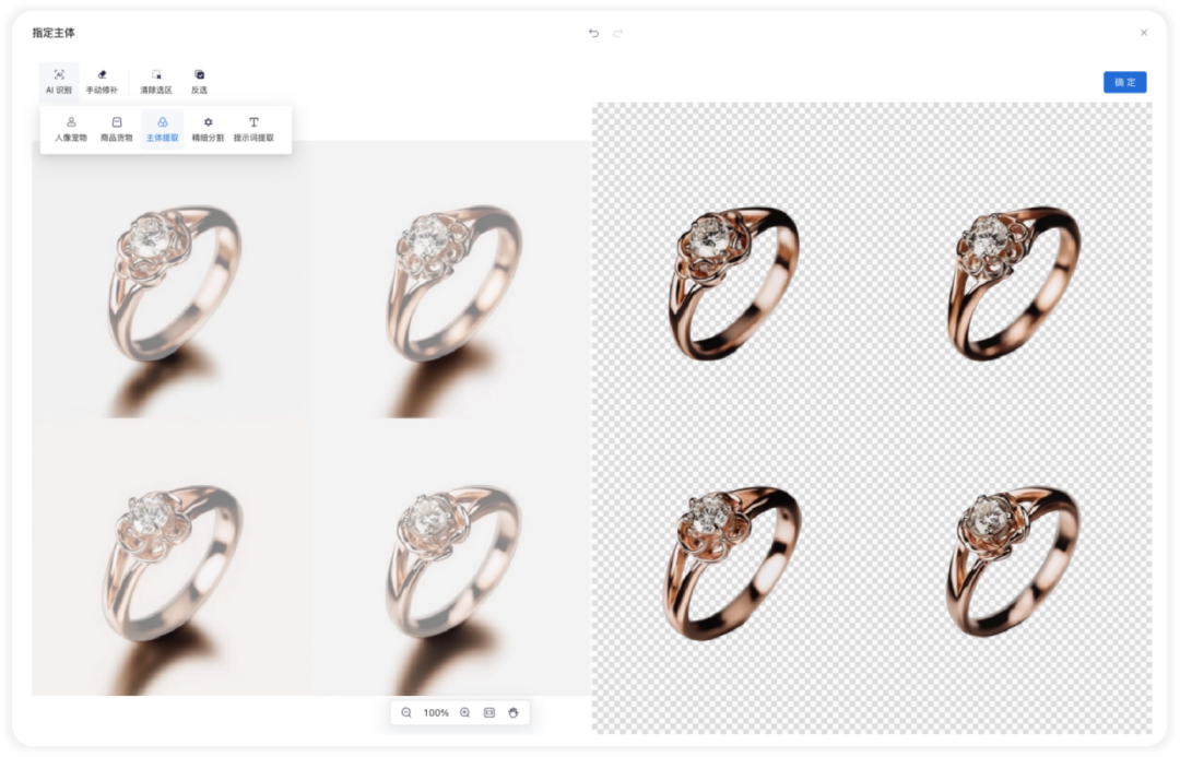 比如針對珠寶(bǎo)行業,「主體提取」「提示詞提取」模式必不可少。在摳圖功能下,點擊「主體提取」,即可精細摳出商品,邊(biān)緣清晰、細節自然,避免手動摳圖時可能出現的瑕疵。