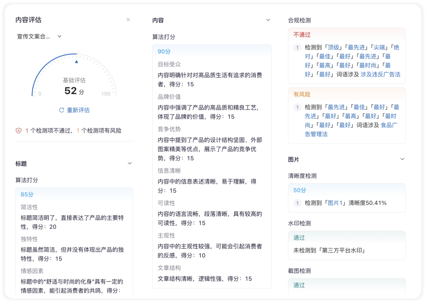 同時,在内容質量把控上,借助大語言模型、OCR 圖像識别等技術,「AI 智能打分」可對内容标題、正文、圖片進行逐項評估及分析,並(bìng)産出評估報(bào)告,比如檢測水印、是否盜圖等,還能從标題質量、文章内容相關性等多方面提供優化建議,讓内容更能吸引用戶眼球,抓住用戶消費心理等,提升内容曝光與轉化率。