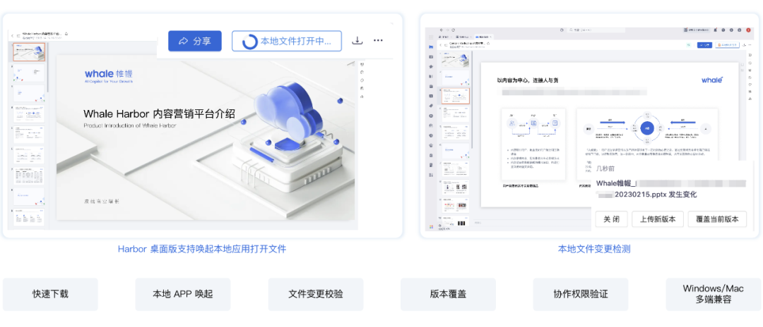 本地快速調用及同步:Harbor 桌面版本除瞭(le)保留 Web 端的所有功能外,還能快速調用本地安裝的 Adobe、Office 等各類專用軟件,預覽和編(biān)輯所有内容,本地文件也能快速回傳至雲端,實現「無感」同步。