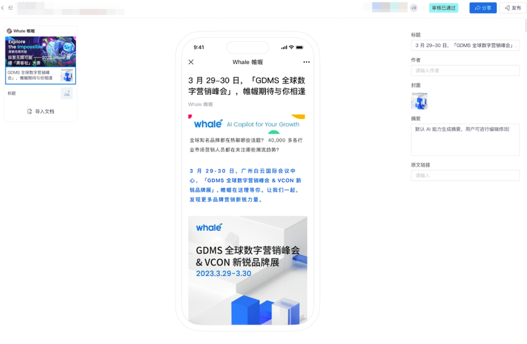 作爲未來内容的 AI Copilot,「帷幄内容營銷中心 Whale Harbor 」順應營銷行業發展趨勢,聚焦海量内容創作難、多樣化場景投放難、部門内外協作難、數據分析難等痛點,提供貫穿内容全鏈路的 AI 算法能力,幫助企業解決從内容生産到内容使用過程中的營銷難題。