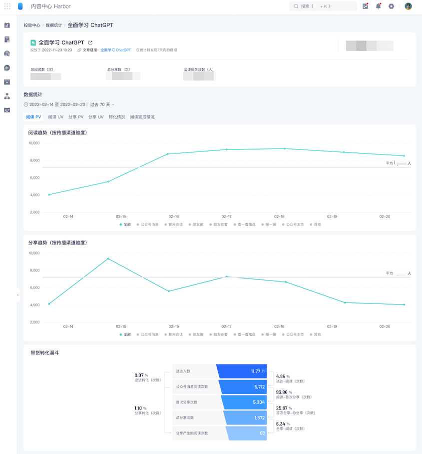 内容評估中心:Harbor 目前支持對内容質量進行多維度評估並(bìng)打分,發現人工審核容易忽視的問題,也有助於沉澱優質内容模闆,方便後續打造「爆款内容」。比如,針對标題,可評估「簡潔性」「獨特性」「情感因素」「誘導性」等;針對正文,可評估「可讀性」「主觀性」「文章結構」等;針對圖片,則可進行「清晰度」「水印檢測」「圖文相關性」等評估。此外,通過發布後内容的數據埋點,對「PV」「UV」「閱讀時長」「轉化率」等核心數據也能一目瞭(le)然。